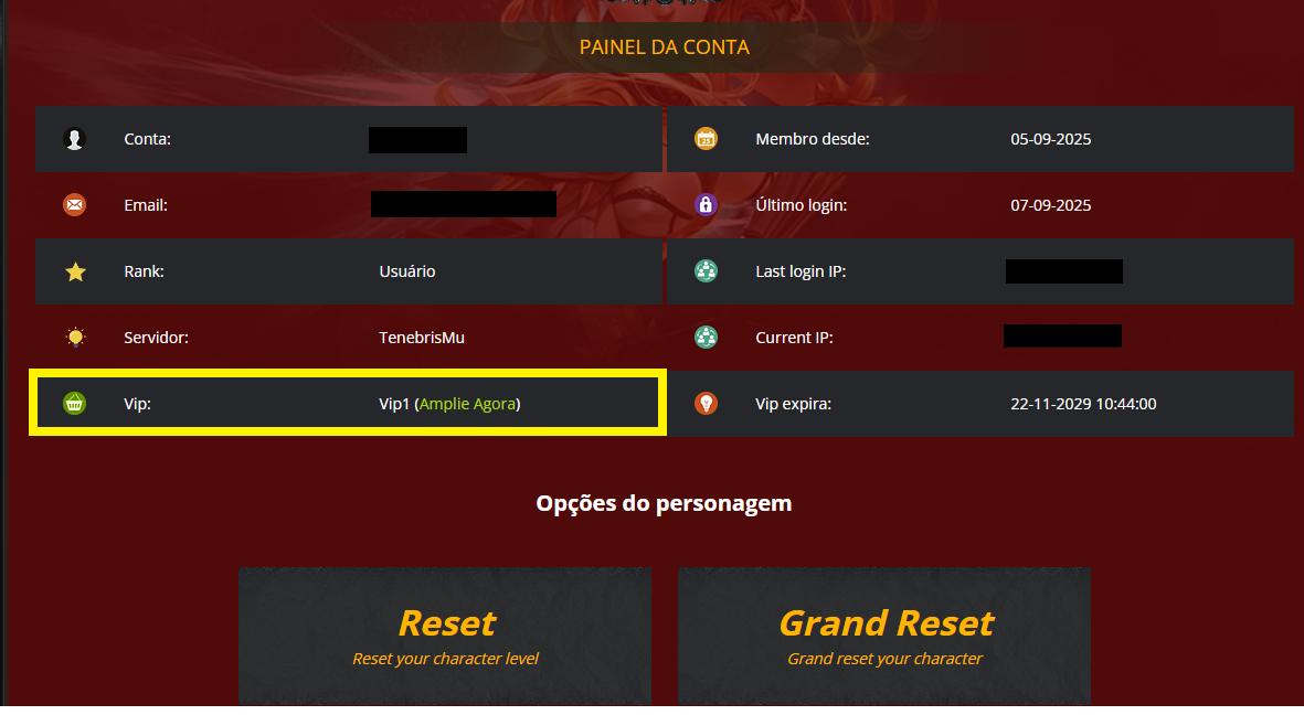 Ainda no Painel da Conta, localize a área destacada com o botão “Comprar VIP”.
